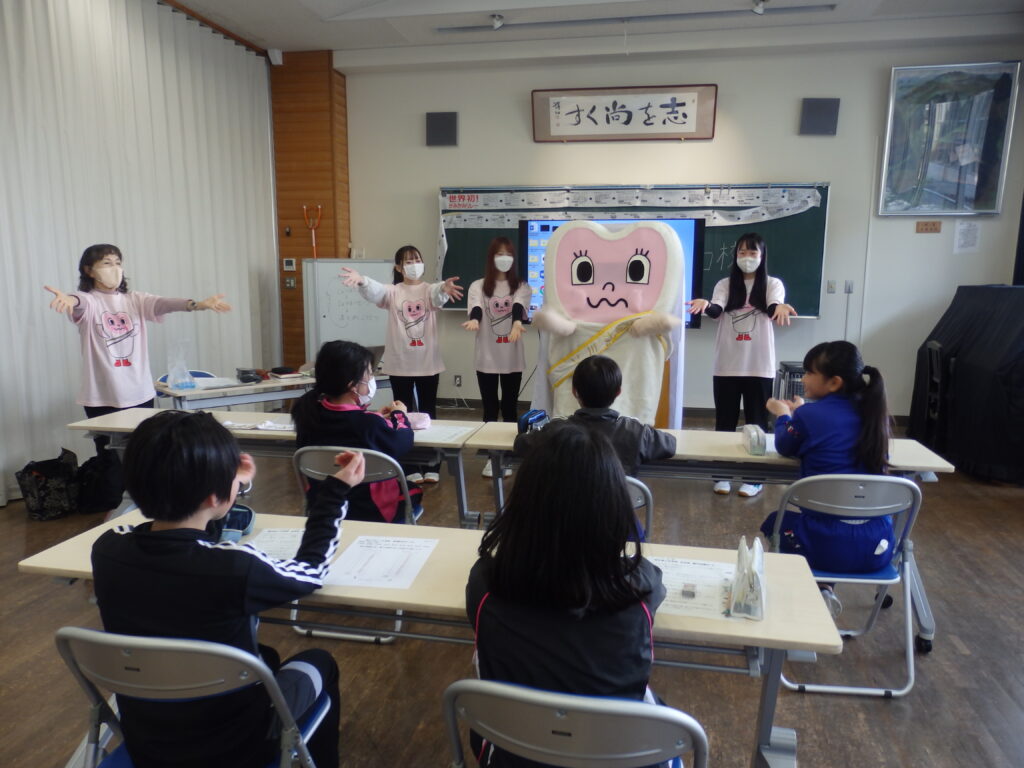 12月12日喬木第二小学校の5年生に「良い歯でよく噛みよい体講座」の出前講座を行いました。安富教授が授業をし、その後学生が5分間、歯のつくりとサーモグラフイの写真を使って咀嚼の効用を伝えました。カミンのかみかみパワーを子ども達に発信し、「よく噛んでたべて健康な体を作りましょうね」とエールを送ってきました!