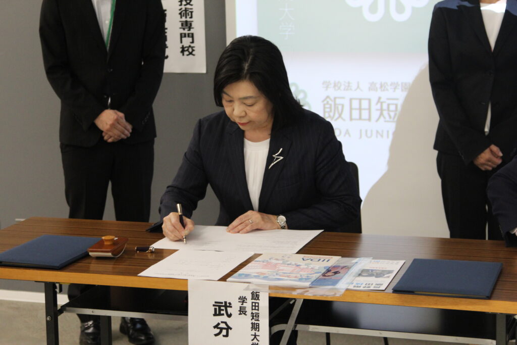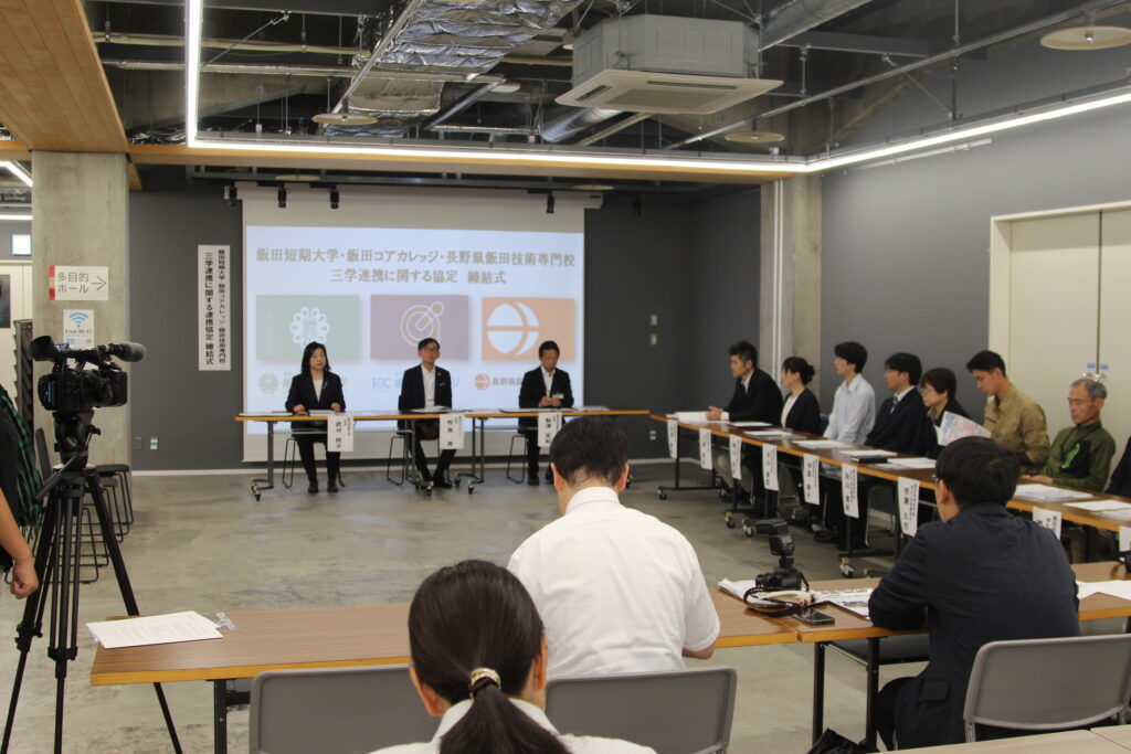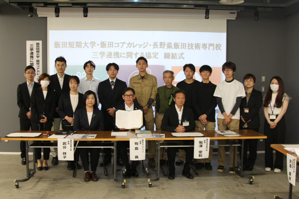 令和7年9月25日(木)、飯田短期大学・飯田コアカレッジ・長野県飯田技術専門校は、教育・研究並びに地域社会における教育活動推進・強化のための連携に関して、包括連携協定を締結しました。 飯田市にある専門分野の違う3校がそれぞれの特性・強みを生かし連携することで新たな価値を生み出し、飯田下伊那地域における人材育成や地域課題への取り組みを進めていきます。