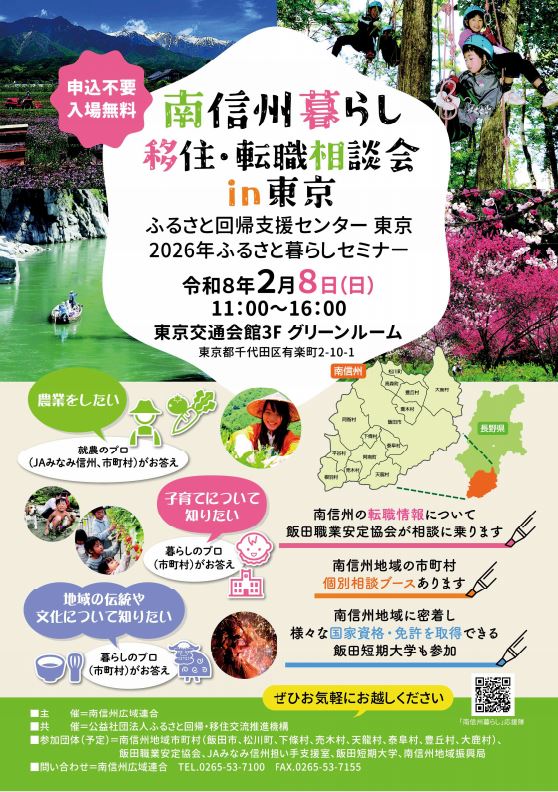 南信州での暮らしや仕事に興味のある方を対象とした**「南信州暮らし 移住・転職相談会 in東京」**が開催されます。