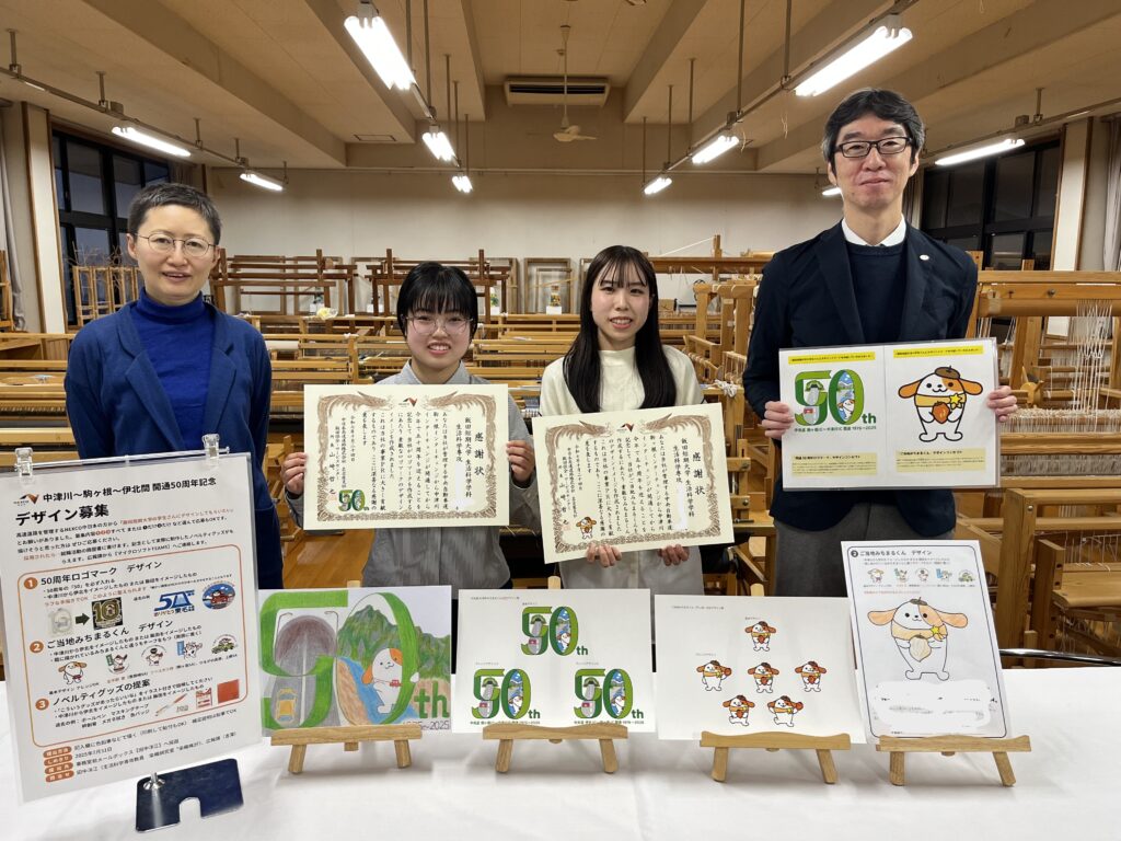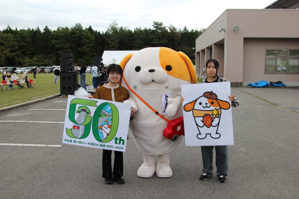 2025 11.10 お知らせ 【産学連携】NEXCO中日本との共同デザイン開発 中央自動車道 駒ヶ根IC~中津川IC間(今年)、伊北IC~駒ヶ根IC間(来年)の開通50周年記念ロゴマークを学内公募し、生活科学専攻学生2名のデザインイメージが採用されました。現在、NEXCO中日本 飯田保全・サービスセンター(長野県飯田市)が出展するイベントや各種広報物において「開通50周年ロゴマーク」と「ご当地オリジナルみちまるくん」が活躍中です!