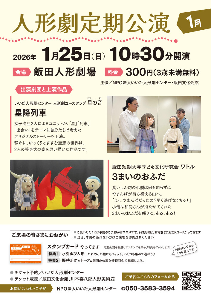 2026 01.15 お知らせ 子ども文化研究会「ワトル」人形劇定期公演のお知らせ 子ども文化研究会「ワトル」が人形劇定期公演に出演します。 今回の演目は「3まいのおふだ」 ハラハラドキドキのストーリーです。人形劇フェスタで演じた作品をブラッシュアップしてお届けします。ぜひ、飯田人形劇場に足をお運びください。 チケットのご予約は、チラシのQRコードから♪