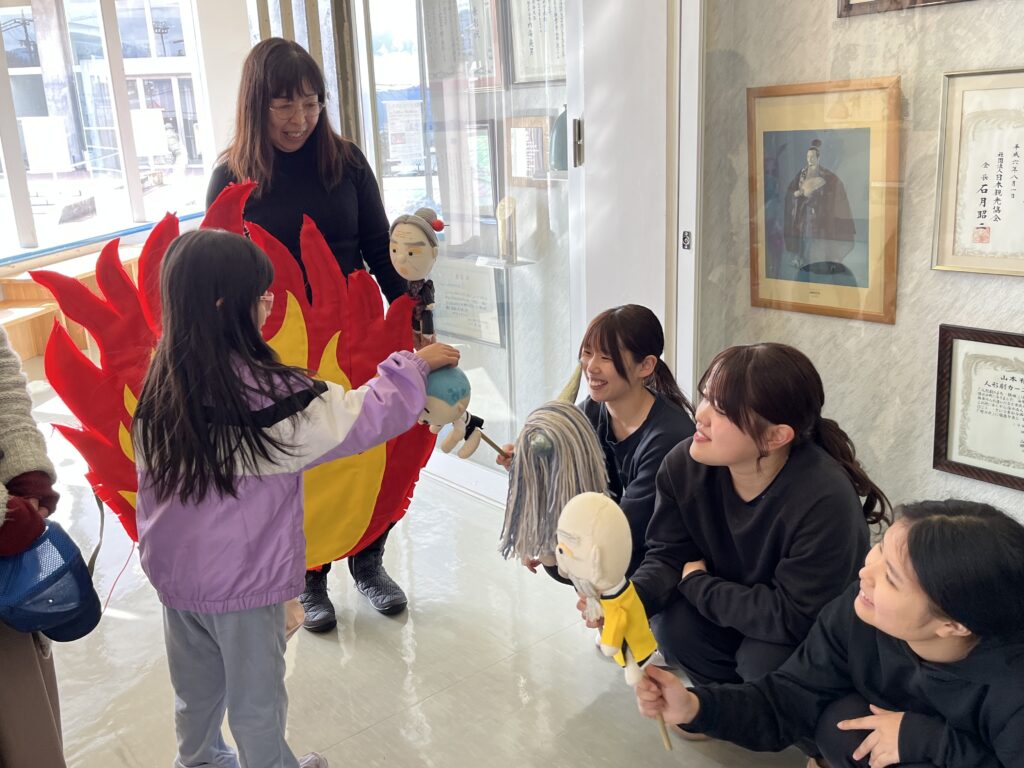 「3まいのおふだ」の上演は人形劇フェスタに続いて2度目。キャストを変えて挑んだ定期公演でした。前回の反省を生かして「後ろまで届く声」「キャラ設定を貫く」を目標に練習してきました。子どもたちもたくさん観に来てくれて、「やまんばの声がかっこいい」「小僧が甘える姿がかわいい」「和尚が意外と強キャラ」等の感想をいただきました。ハプニングもありましたが、楽しく演じられて大成功でした!