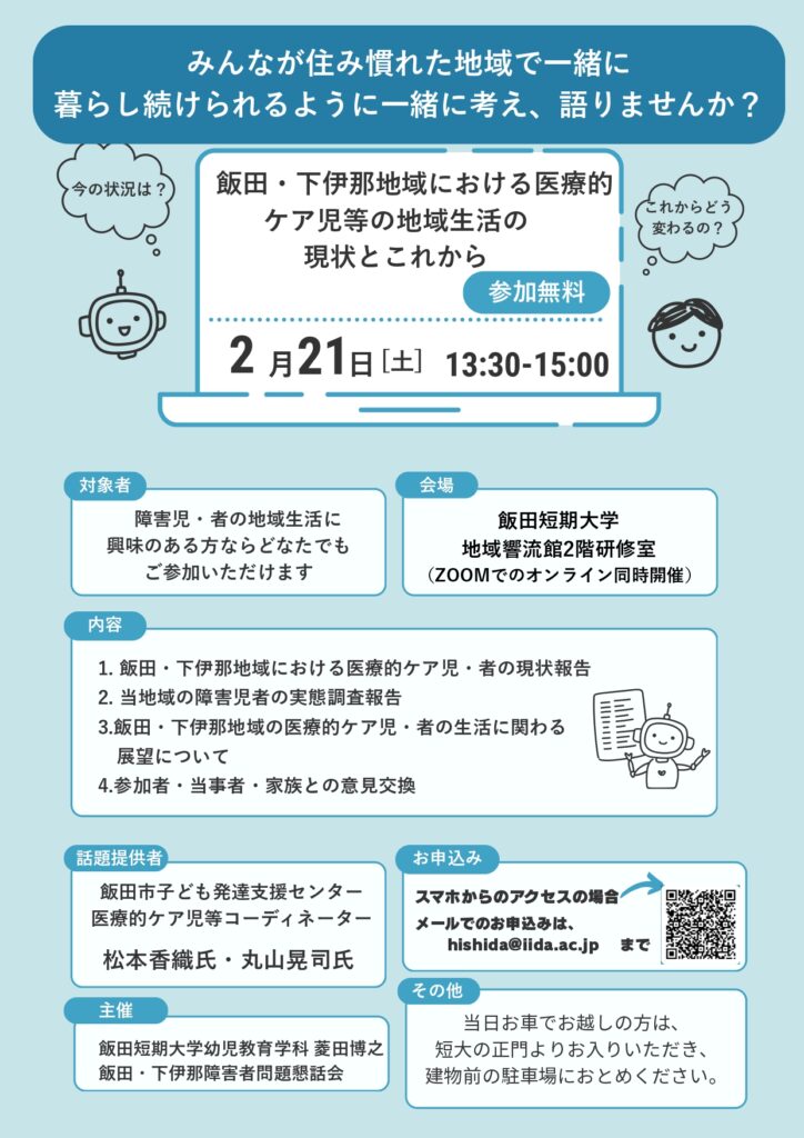 今回は、飯田市子ども発達センターひまわりから医療的ケア児等コーディネーターのお二人をお迎えし、飯田・下伊那地域における医療的ケア児・者の現在の状況と、これからの展望についてお話を伺います。 その後、参加者のみなさんとともに、ざっくばらんな意見交換の時間も設けています。