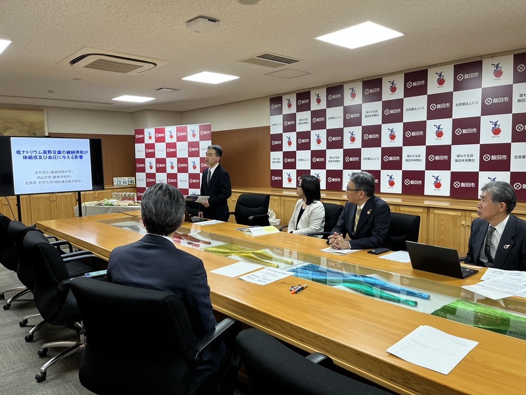 この度、飯田短期大学、旭松食品株式会社、飯田市、南信州・飯田産業センターによる産官学連携研究の成果が『科学誌 Asian Food Science Journal 』に掲載され、飯田市役所2階市長公室において佐藤健飯田市長への報告会を実施しました。