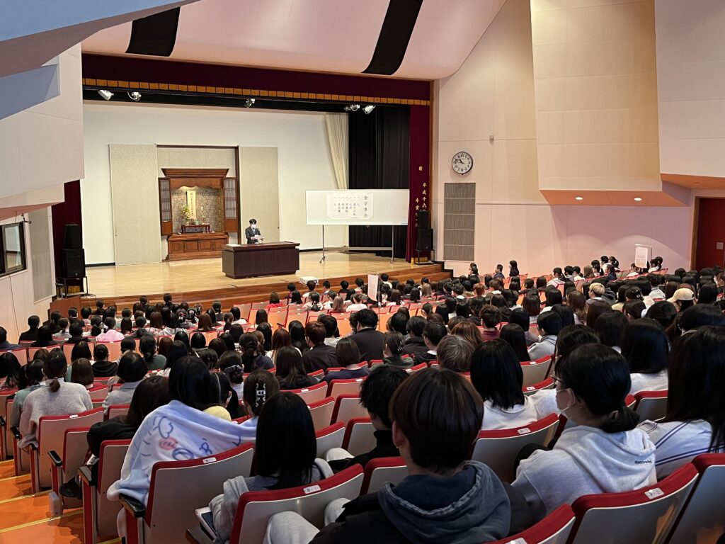 新入生オリエンテーション・履修登録も済み、いよいよ前期授業が始まりました。本日は本年度初めての全学集会が行われ、看護学科3年生3名が感話を発表してくれました。