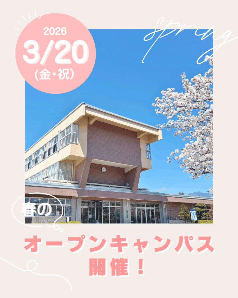 2026 02.06 オープンキャンパス 3/20(金・祝)オープンキャンパスを開催します! 3/20(木・祝)にオープンキャンパスを開催します。今回のオープンキャンパスでは、参加者の皆さんに楽しんでいただける特別企画をご用意しています!お申し込み・詳細は続報をお待ちください。
